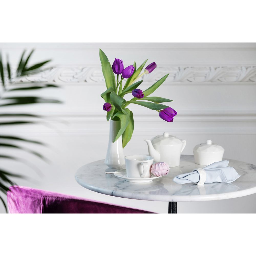 Линейка столовой посуды Diamante Bianco — настоящий бриллиант коллекции Altavolo. Структура и пропорции граней чайника в точности повторяют верхнюю часть бриллианта классической огранки — корону. Присмотритесь — и вы увидите, как играет свет на молочно-белом фарфоре.Емкость 600 мл.