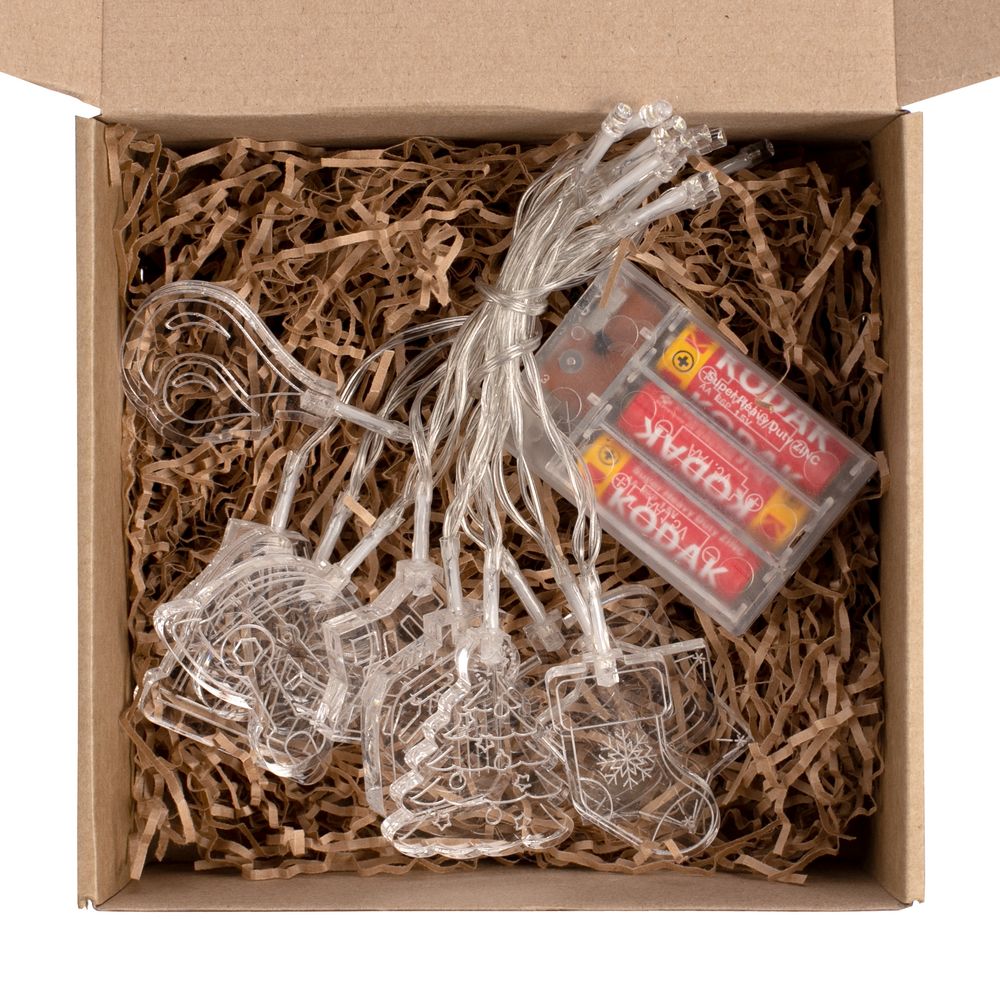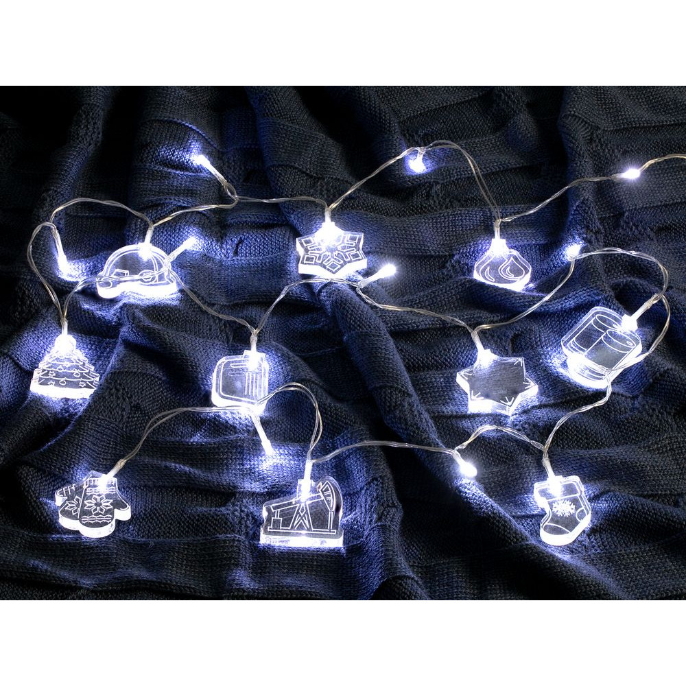 Гирлянда состоит из 20 светодиодов холодного света и 10 акриловых фигурок.