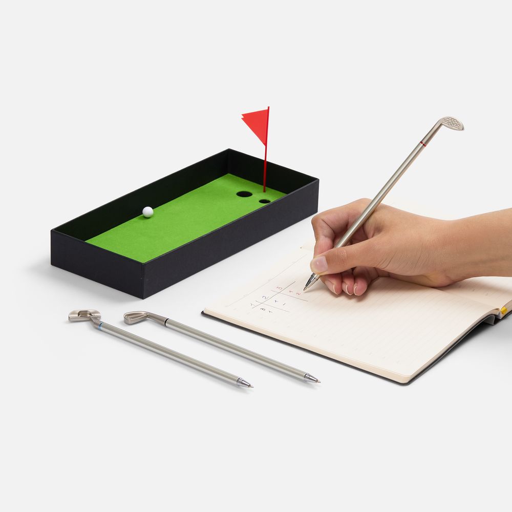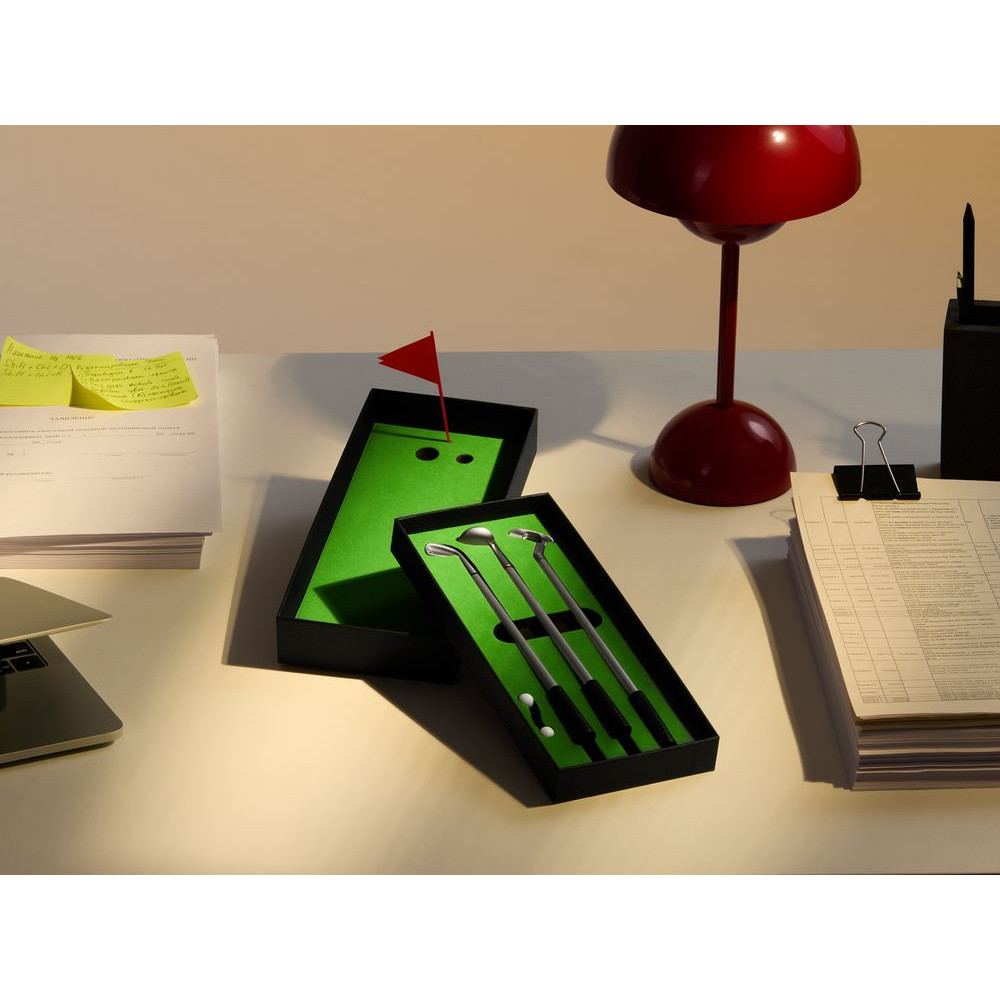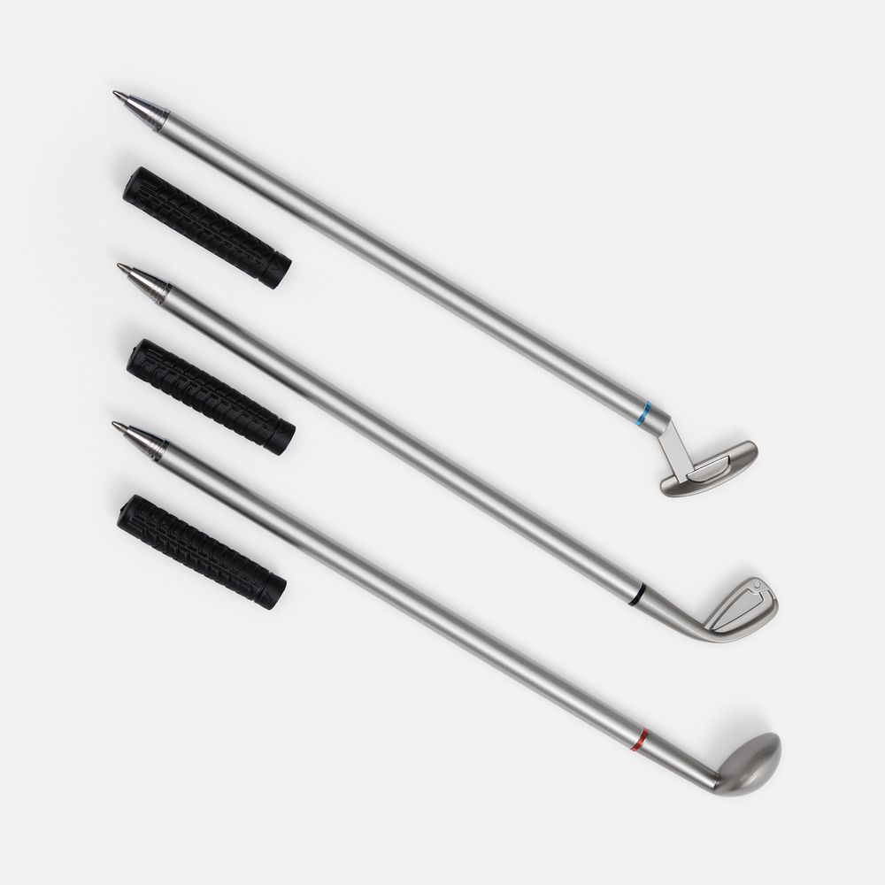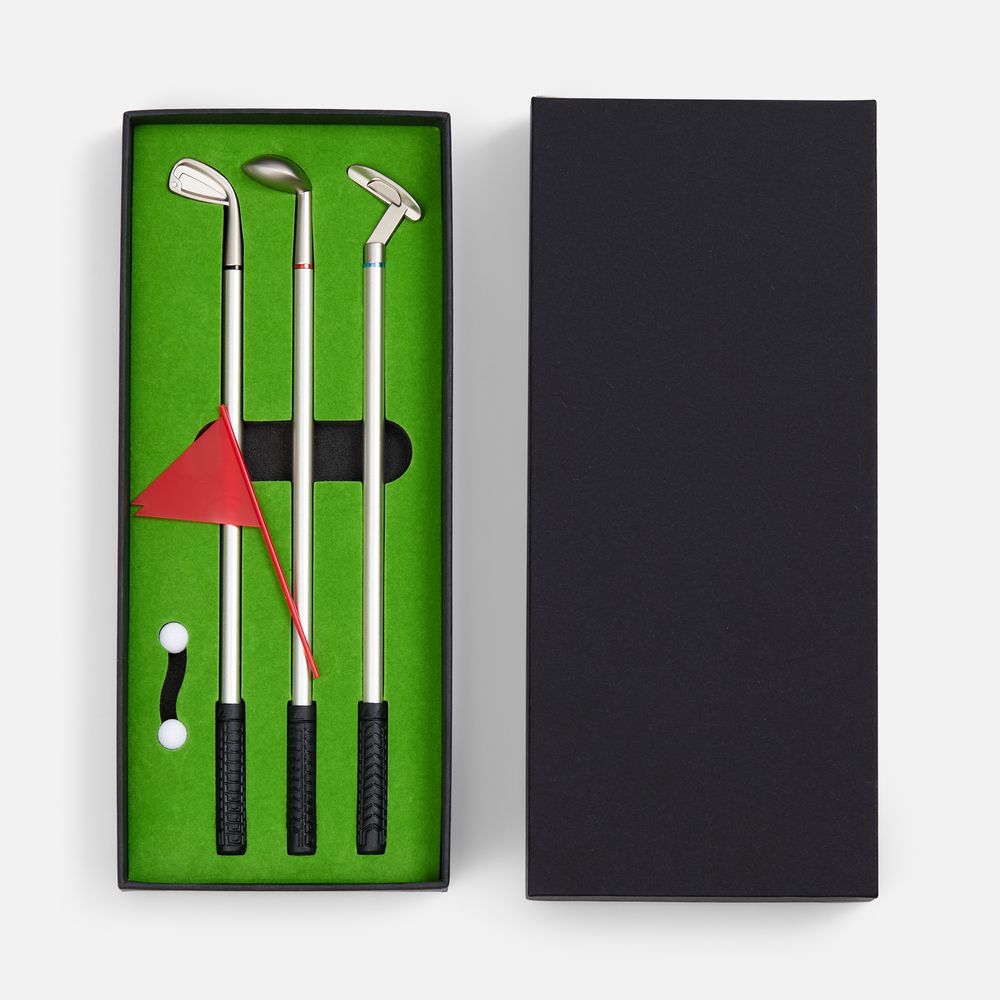 В комплекте: 3 клюшки-ручки со сменным стержнем с синими, черными и красными чернилами, 2 мячика для гольфа, флажок и подарочная коробка.Не является детской игрушкой. Не предназначено для детей!